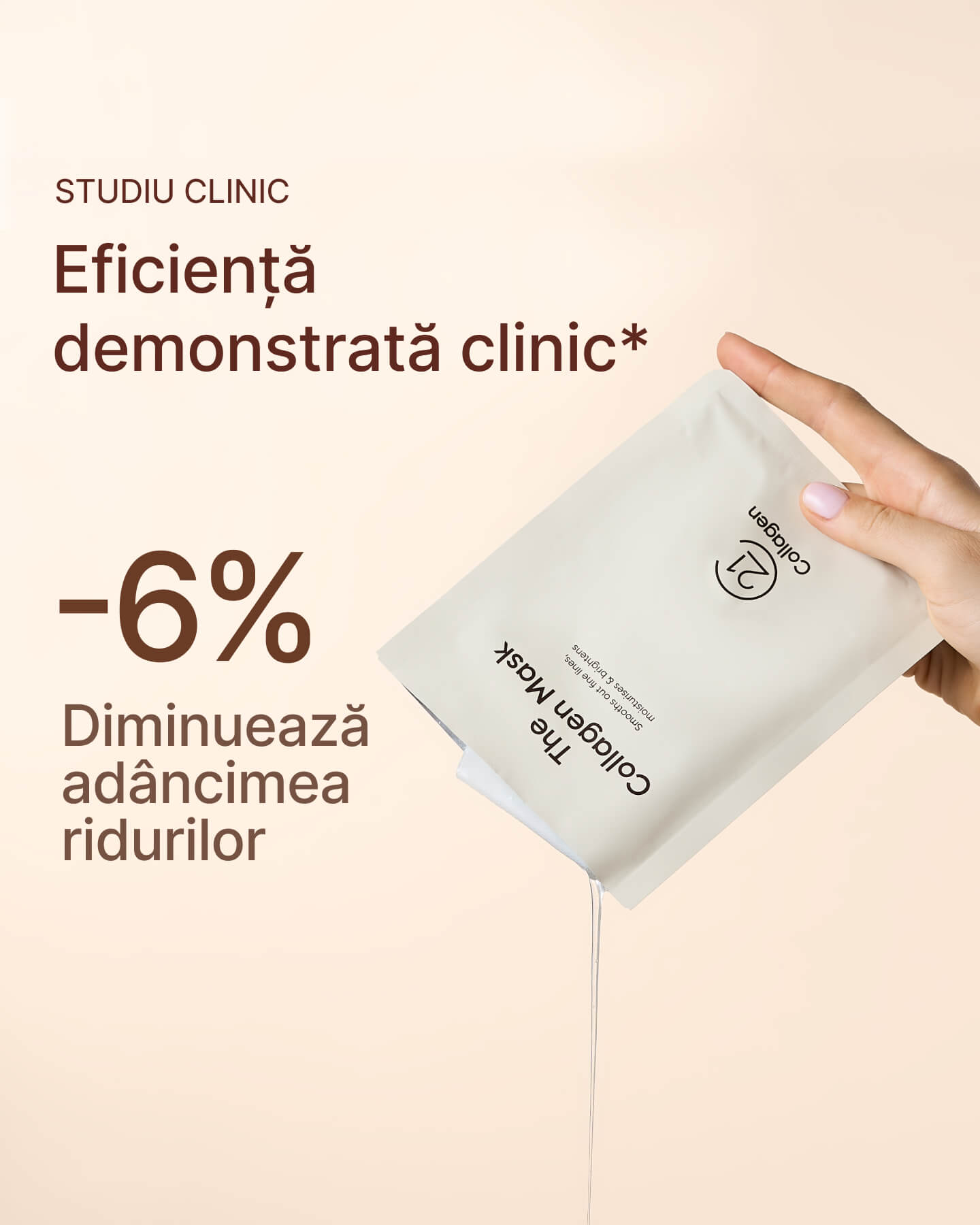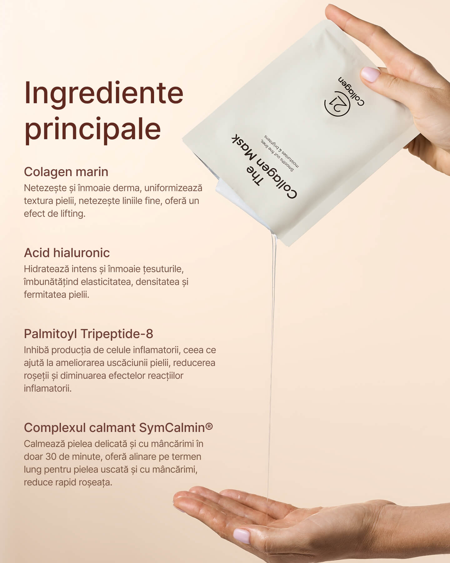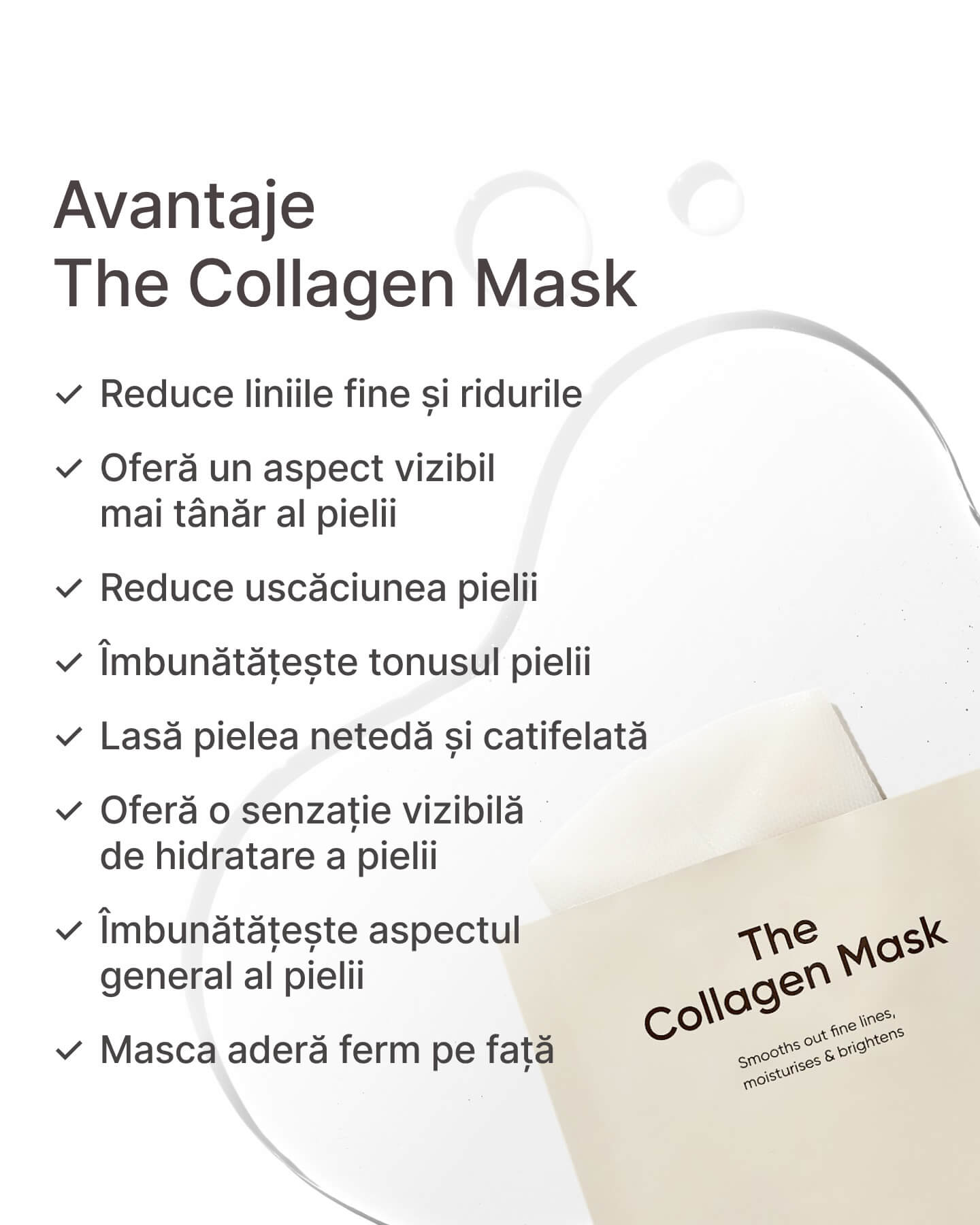 The Collagen Mask a fost gândită pentru o îngrijire premium a pielii, fiind realizată din bio-celuloză de înaltă calitate și infuzată cu un ser de ingrediente active, ce includ colagen marin, acid hialuronic și complexul calmant SymCalmin®. Masca ajută la reducerea ridurilor, îmbunătățirea elasticității și conferă un aspect radiant și sănătos.